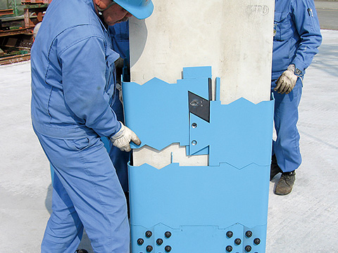 波形に切断加工した鋼板を既設のコンクリート柱周囲に積上げ、コンクリート柱と鋼板との隙間にモルタルを充填して、柱のせん断破壊防止およびじん性能を向上させる耐震補強工法です。